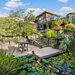 Stepping outside, the property reveals an expansive outdoor sanctuary. Unlike many hill properties, this site offers two areas of flat lawn, providing space for children to play or for gardeners to flourish. The grounds are beautifully appointed with a glasshouse, a tranquil fish pond, and a paved patio area ideal for alfresco dining.