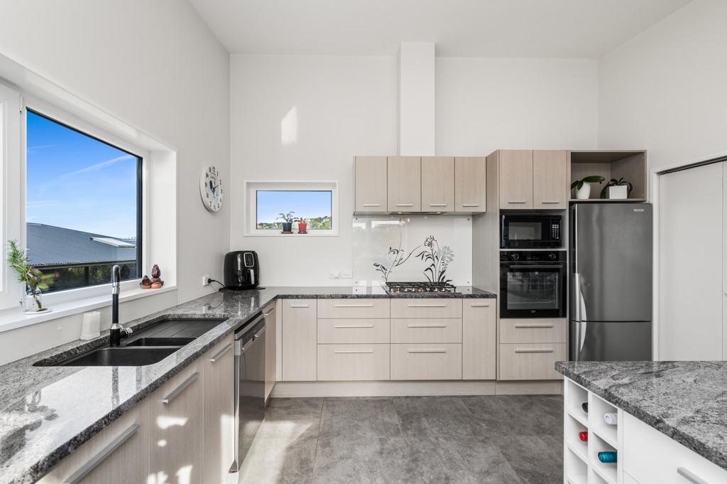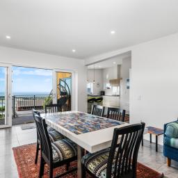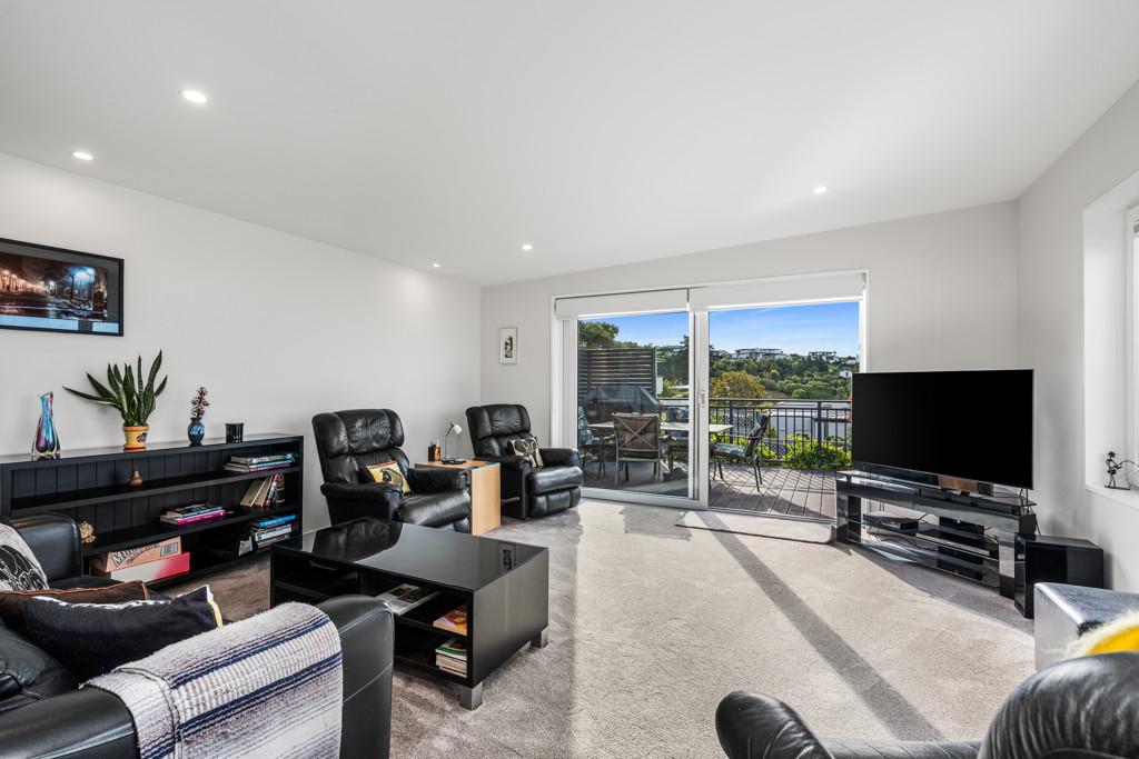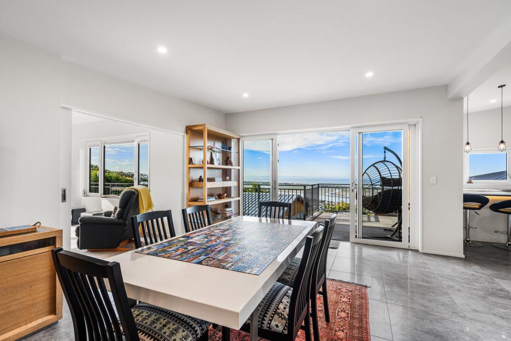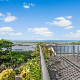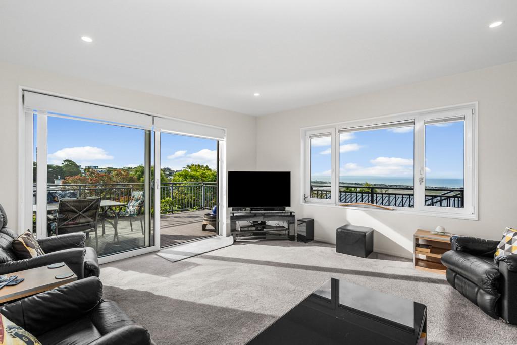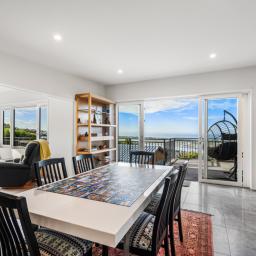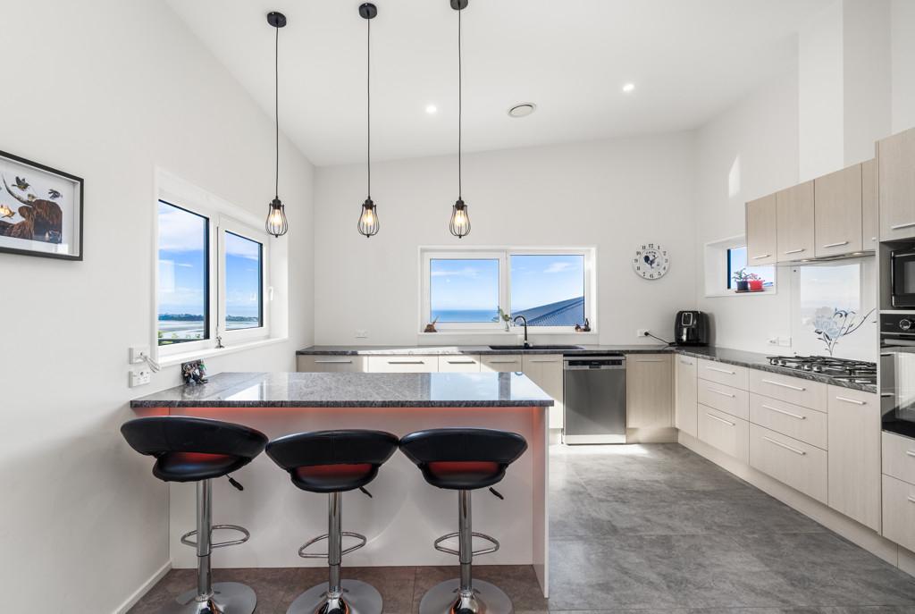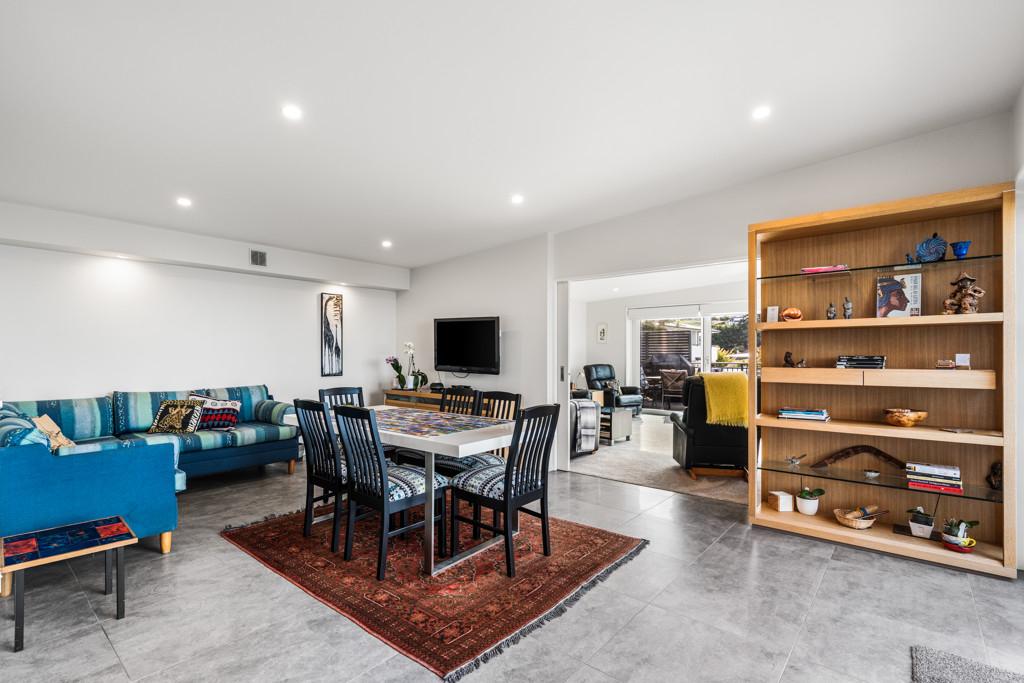 The heart of the home is a sophisticated open-plan kitchen, dining, and living area, where tiled flooring provides durability and a study is contained behind bi-fold doors. This space flows effortlessly out to a generous deck, perfect for sunset entertaining or quiet morning coffees overlooking the water. A formal living room offers the flexibility to be closed off for privacy, while still maintaining a seamless connection to the outdoor decking and the vista beyond.