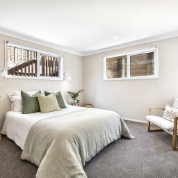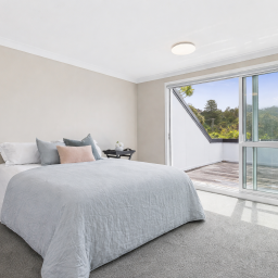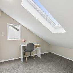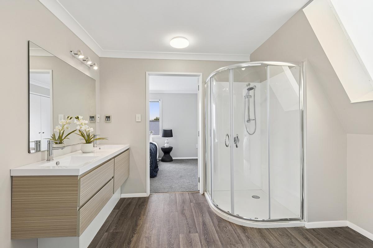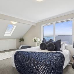Upstairs, two further double bedrooms enjoy an elevated perspective, with one opening to its own private deck to take in the captivating inlet views. An office nook provides a quiet space for work or study, while a thoughtfully designed ensuite, accessible from both bedrooms, adds both convenience and privacy.