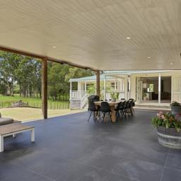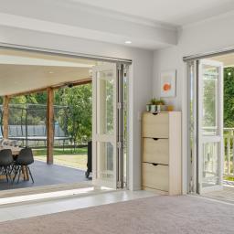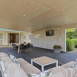 A large ranch slider creates seamless indoor-outdoor flow to a substantial entertaining space-perfect for long summer evenings and relaxed gatherings beside the pool.