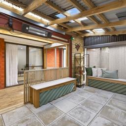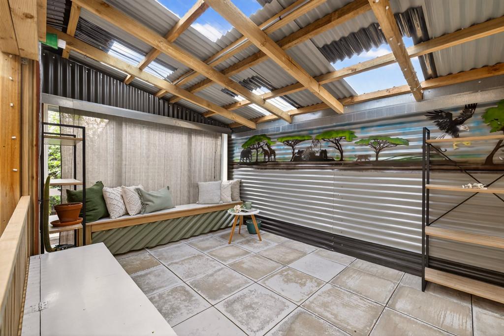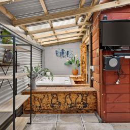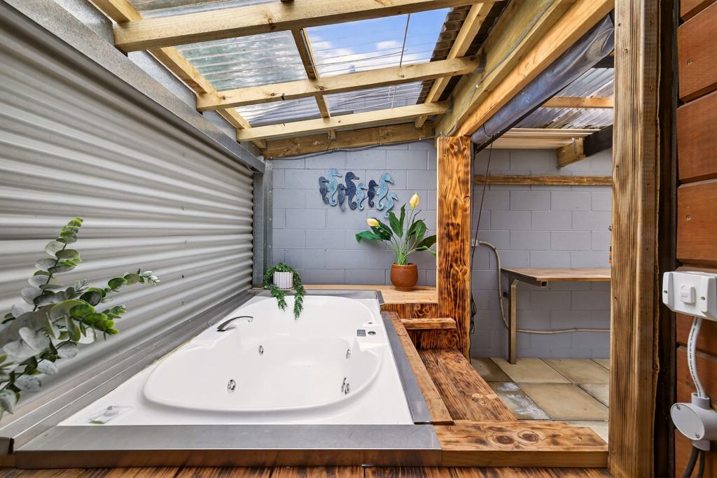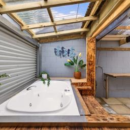 - Private covered outdoor oasis with spa bath and ample room for entertaining