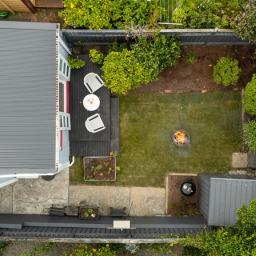 - An exceptional sheltered flat lawn and rear deck that enjoys excellent afternoon sunshine