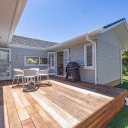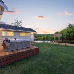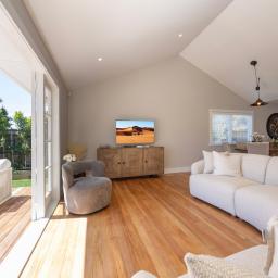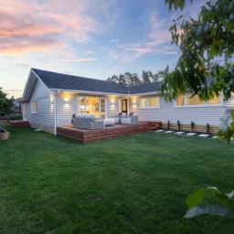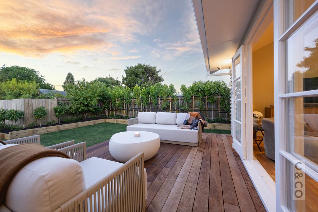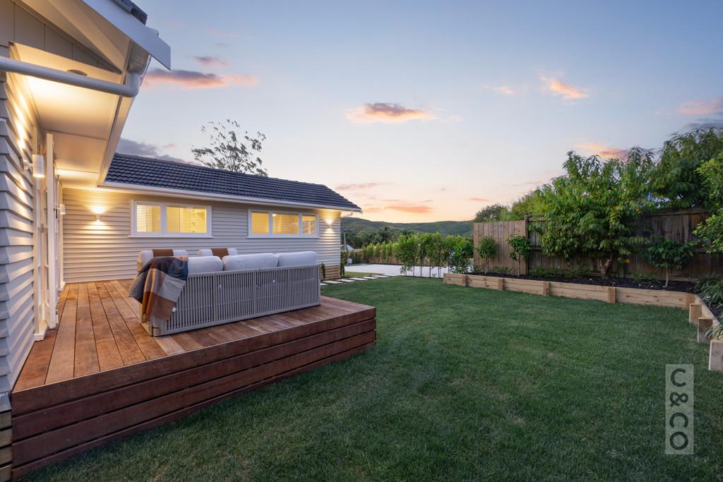 The kitchen opens directly to a generous deck designed for entertaining, overlooking a wide, flat lawn - rare, usable space that families actually want.