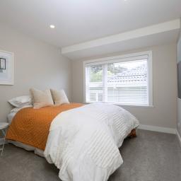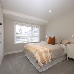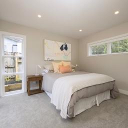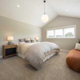 Original solid, detailed rimu doors, upcycled from a city bungalow, sit alongside matai flooring, feature lighting and a refined palette of Half Truffle walls with Sea Fog trim. Plush Michigan Avenue carpet with Luxura and RhinoShield protection offers long-term durability with a 25-year wear and fade warranty.