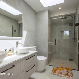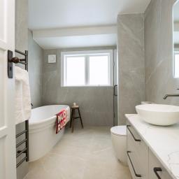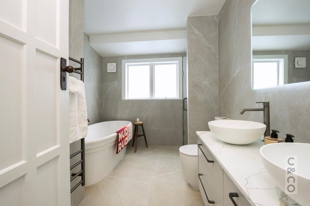 Bathrooms are finished with Spanish tiles, Italian tapware, custom glass showers with tiled niches and underfloor heating. The Warndon solid bath by Victoria + Albert is both sculptural and substantial - a feature in its own right.