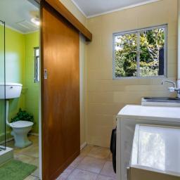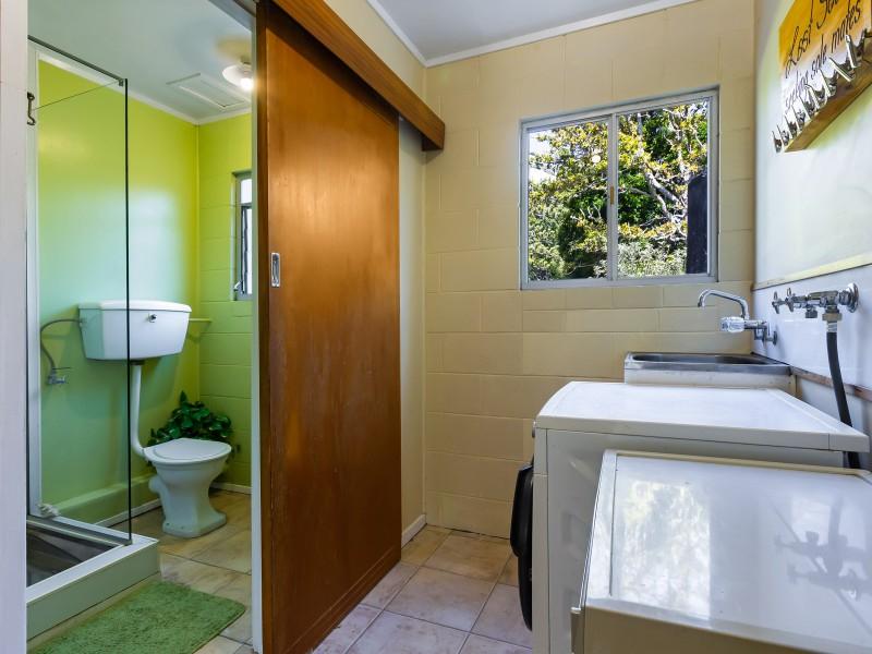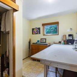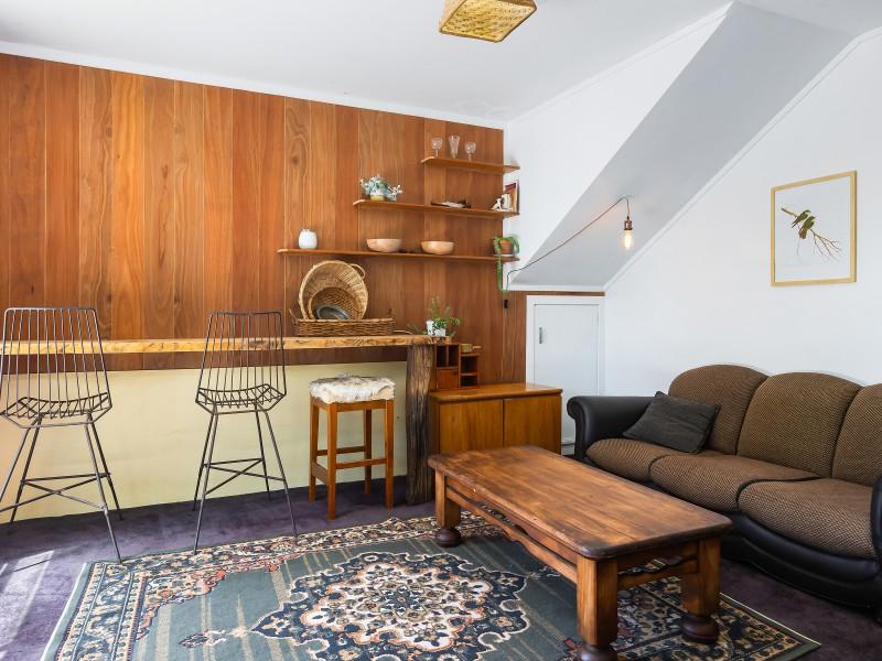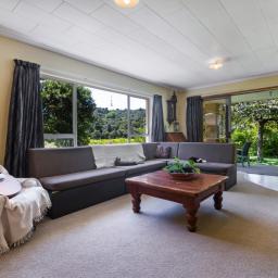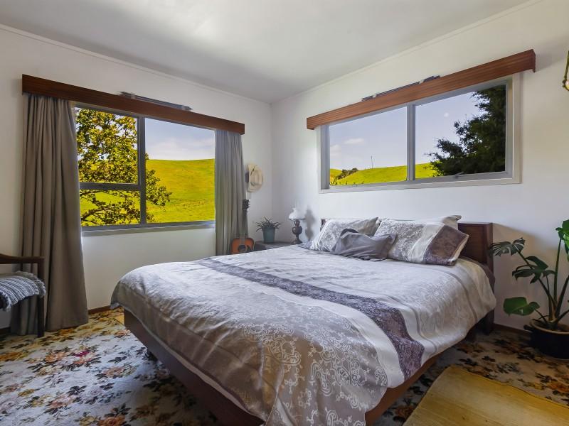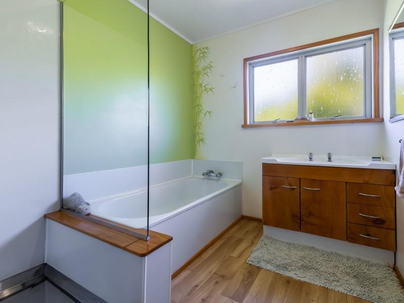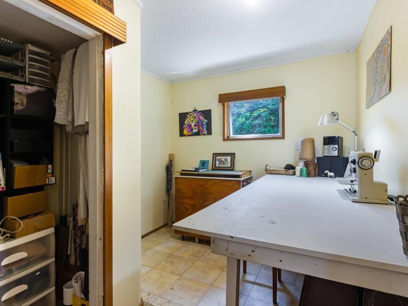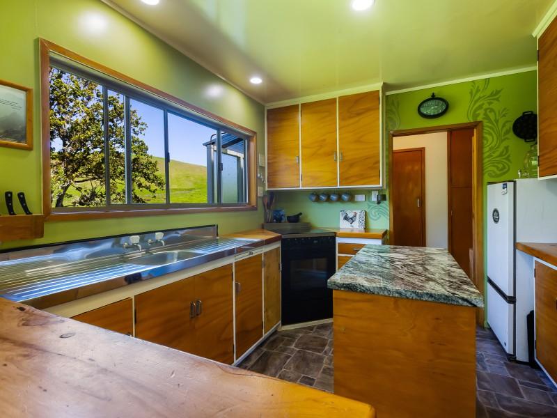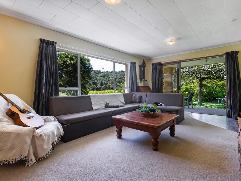 The home features comfortable open-plan living, warmed by a woodburner and supported by a heat pump for year-round comfort. The kitchen is fitted with handcrafted macrocapa cabinetry and a moveable island, offering flexibility for everyday living and entertaining. The former internal-access garage has been converted into a generous multipurpose room, ideal for hobbies, storage, or working from home.