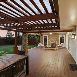 Outside, a large covered deck with gas fire, outdoor speakers, and a fully appointed outdoor kitchen extends the living space into the landscape. The views across the garden to the distant mountains are the kind that sell homes.