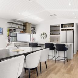 The kitchen anchors the home in style - premium appliances, sleek cabinetry, and an island built for entertaining. It flows seamlessly into expansive open-plan living, where oversized sliders open wide, blurring the line between inside and out.
