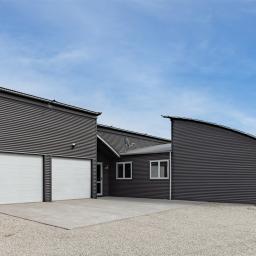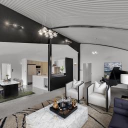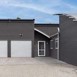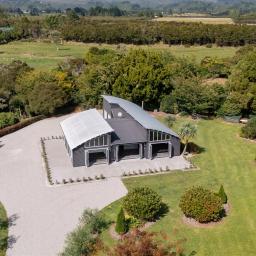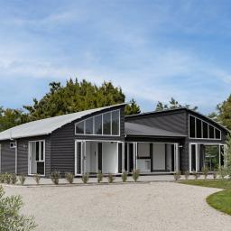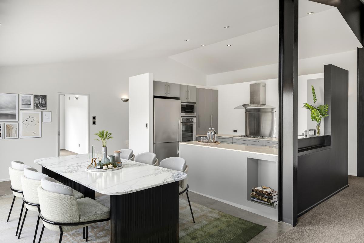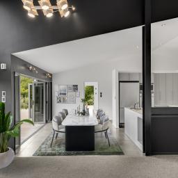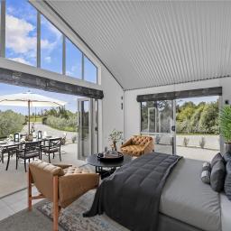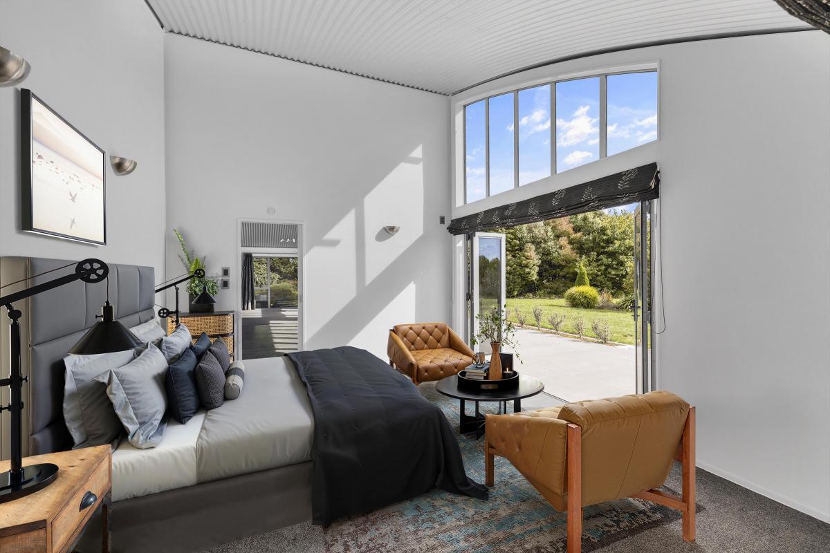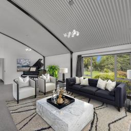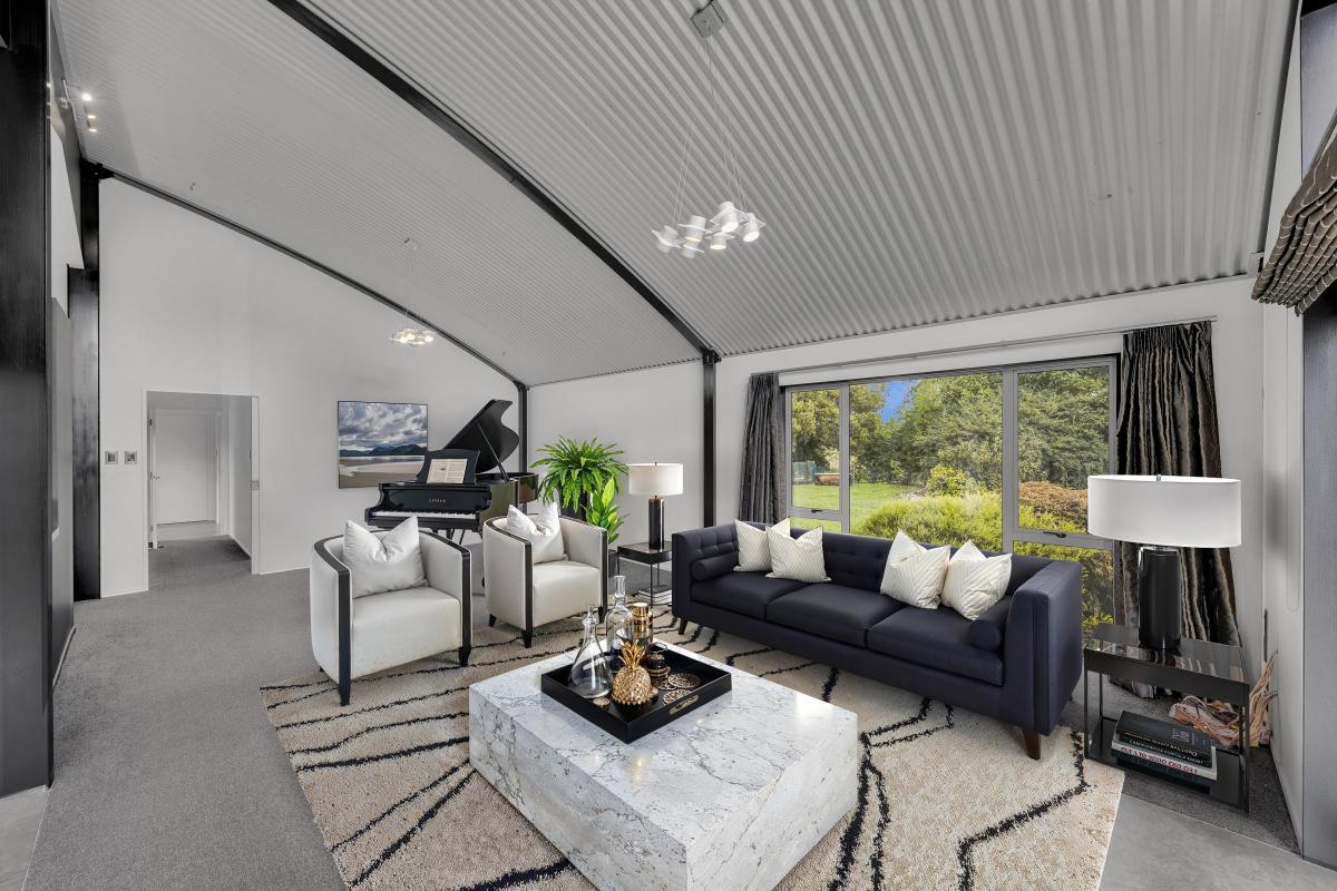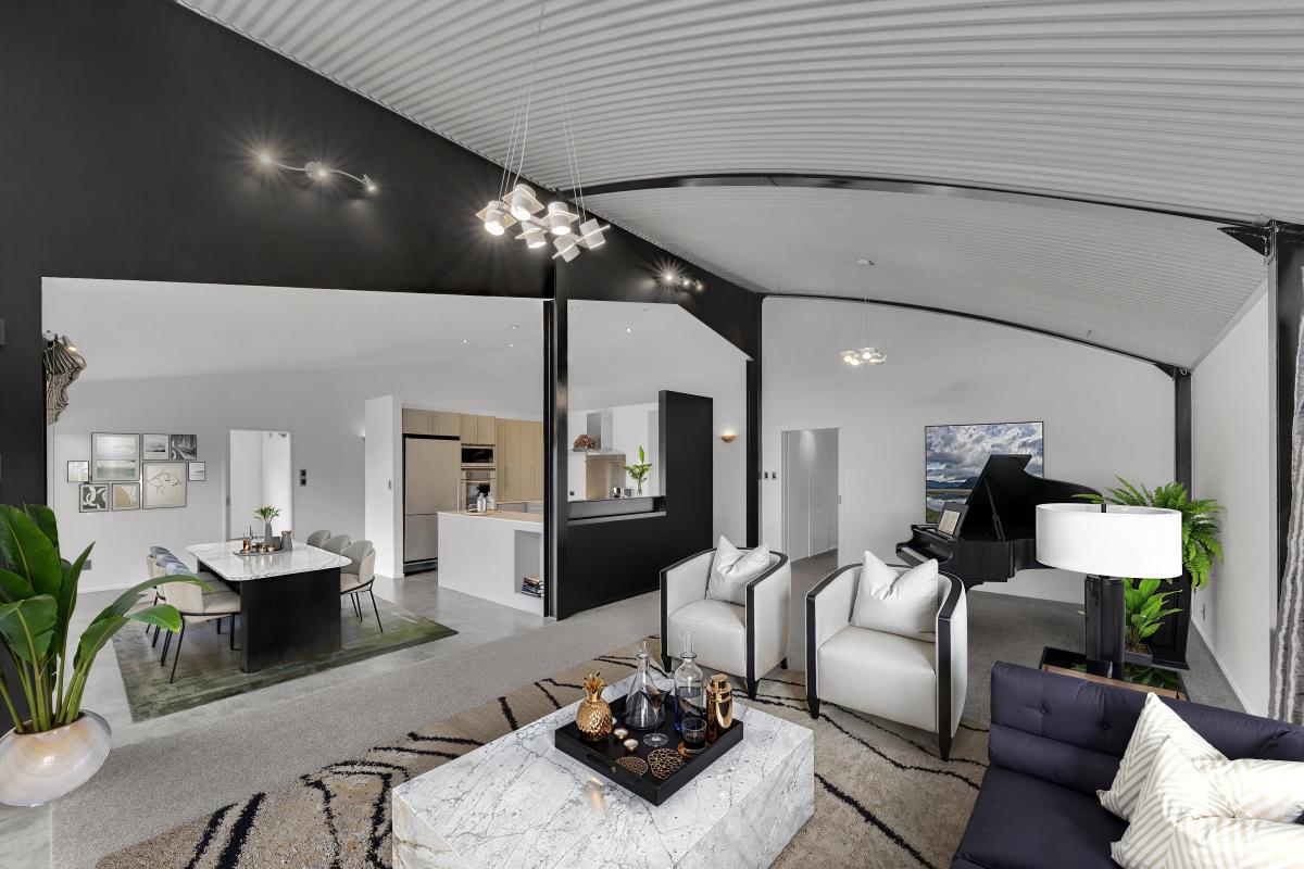 Designed with architectural intent, the home showcases exposed steel beams, dramatic gable windows, and impressive high-stud ceilings that create light-filled, open living spaces. The seamless flow between kitchen, dining, and lounge makes entertaining effortless while maintaining a sense of structure and style.