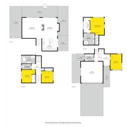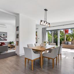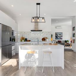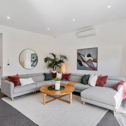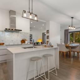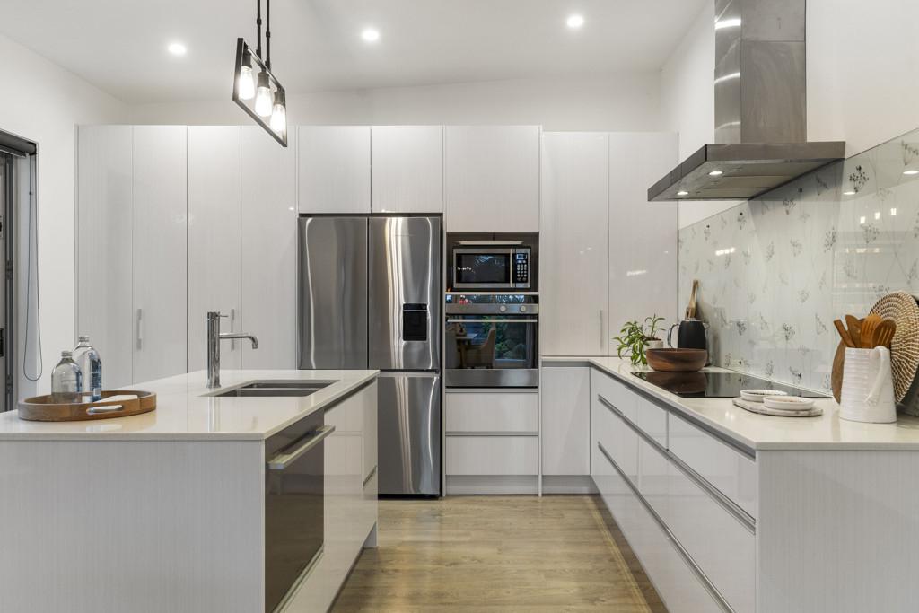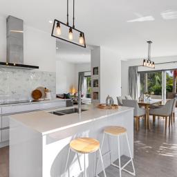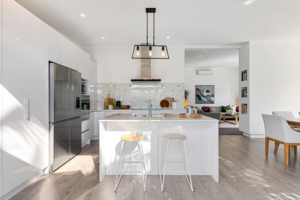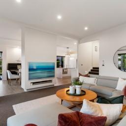 Designed for lifestyle living, the home features multiple living spaces, creating several entertaining areas. The main deck extends from the living room, while a secondary deck sits beside the kitchen & dining area with the spa pool positioned alongside.
