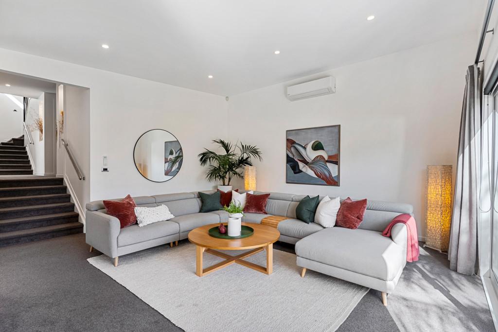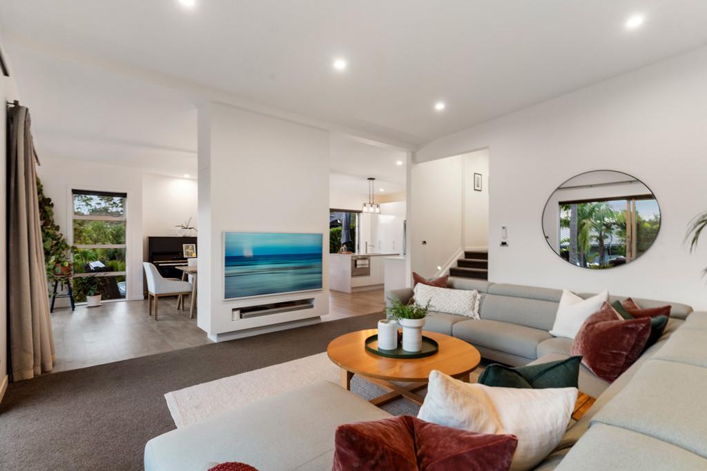 The main living level forms the heart of the home, where the spacious living room flows through to the dining area and modern kitchen. Large sliding doors open directly to an expansive entertaining deck, creating seamless indoor-outdoor lifestyle living across multiple levels.