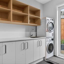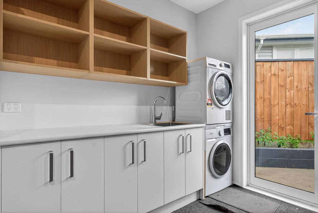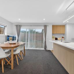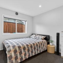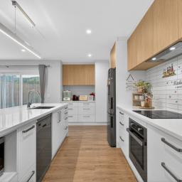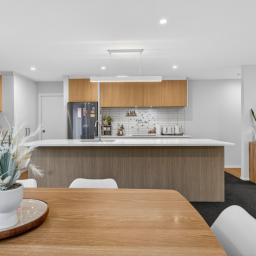 At the heart of the home is a light-filled, open-plan kitchen, dining and living area designed for effortless everyday living and entertaining. The contemporary kitchen features engineered stone benchtops, a tiled splashback, stylish pendant lighting and quality finishes throughout. Large stacker doors extend the living space seamlessly out to a private deck, the perfect spot for summer BBQs, morning coffee or relaxed evenings with friends.