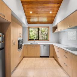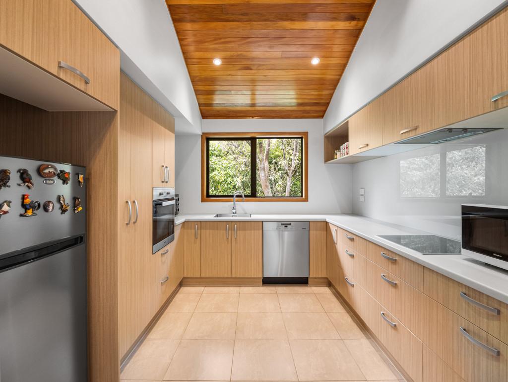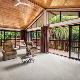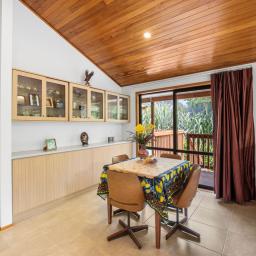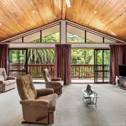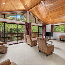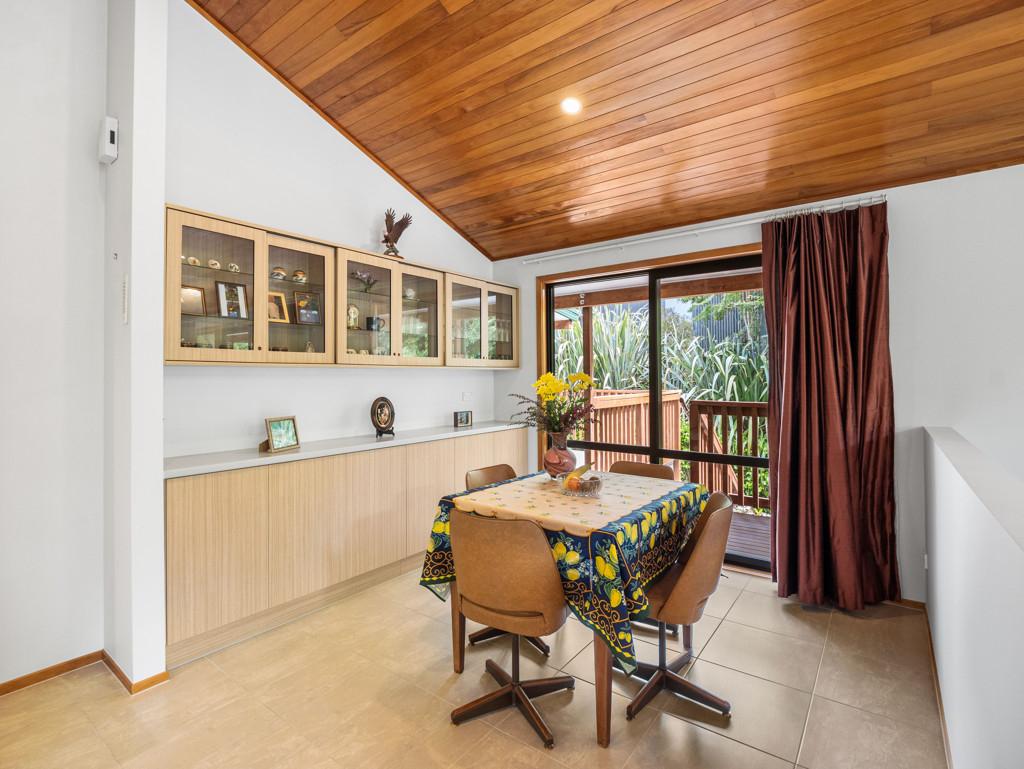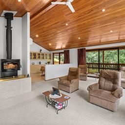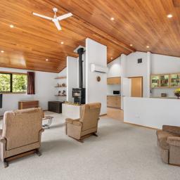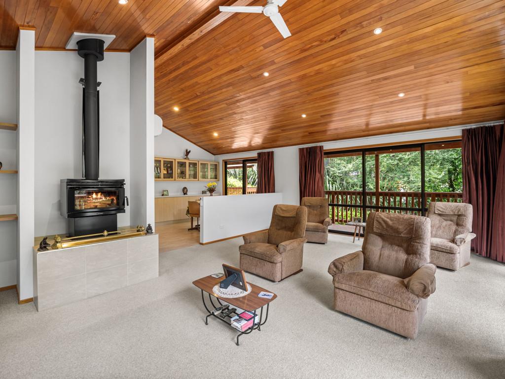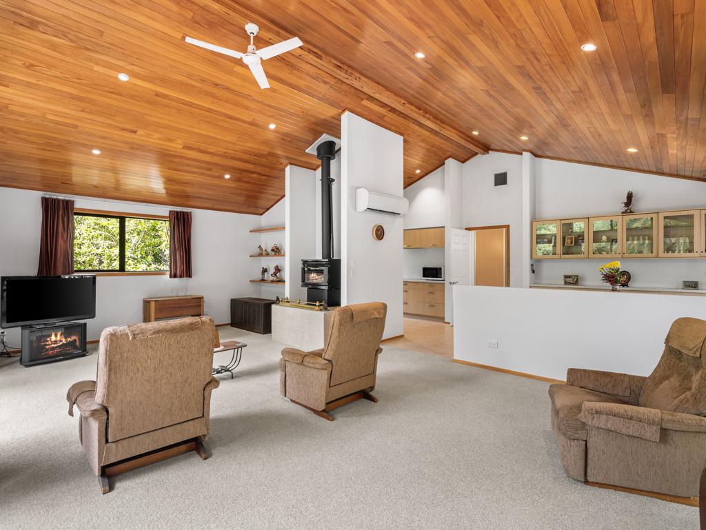 The heart of the home is defined by the warmth of raked Rimu ceilings that span the open-plan living, dining, and kitchen areas, creating an atmosphere of rustic elegance and volume. This central hub flows seamlessly to the outdoors through two sets of sliding doors, leading you onto an extensive deck that perfectly immerses you in the surrounding oasis of greenery. The dining area is thoughtfully designed, featuring a beautiful built-in sideboard and cabinetry. Climate control is effortless regardless of the season; stay cosy with the clean-air woodfire and heat pump in the living area, while a heat transfer system ensures the three bedrooms stay warm. An additional heat pump in the hallway provides total home comfort throughout the year.
