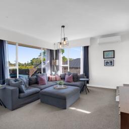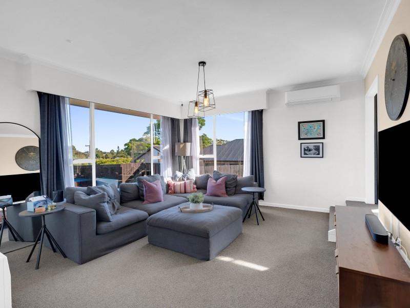 The living room is spacious and inviting, with large windows that draw in plenty of sunshine and outlook to the lawn, making it a relaxing space to unwind or gather with friends and family. A heat pump ensures year-round comfort, keeping the home warm in winter and cool through summer.