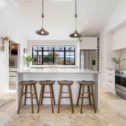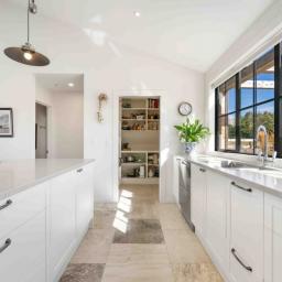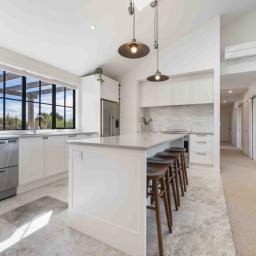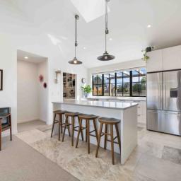 Step inside and the quality is immediately evident. The heart of the home is a stunning country-inspired kitchen, where classic shaker-style joinery and designer tiled flooring create a refined yet welcoming space. A freestanding chef’s dream oven with five hobs, quality appliances, a generous island bench, and a walk-in pantry make this a kitchen designed for both everyday living and entertaining.