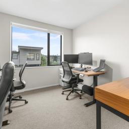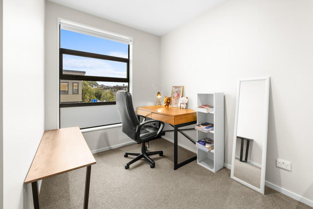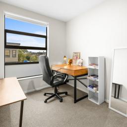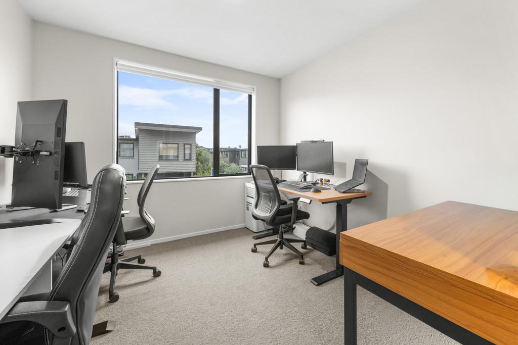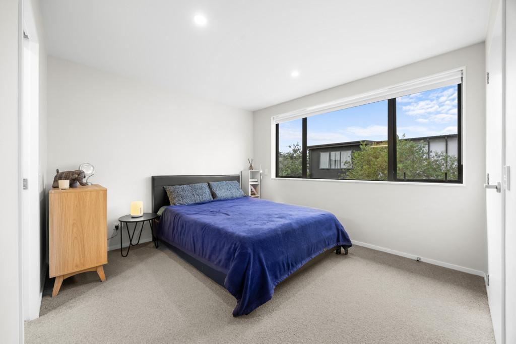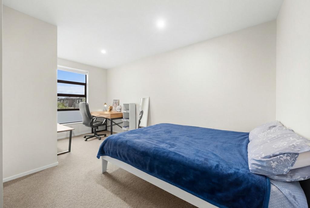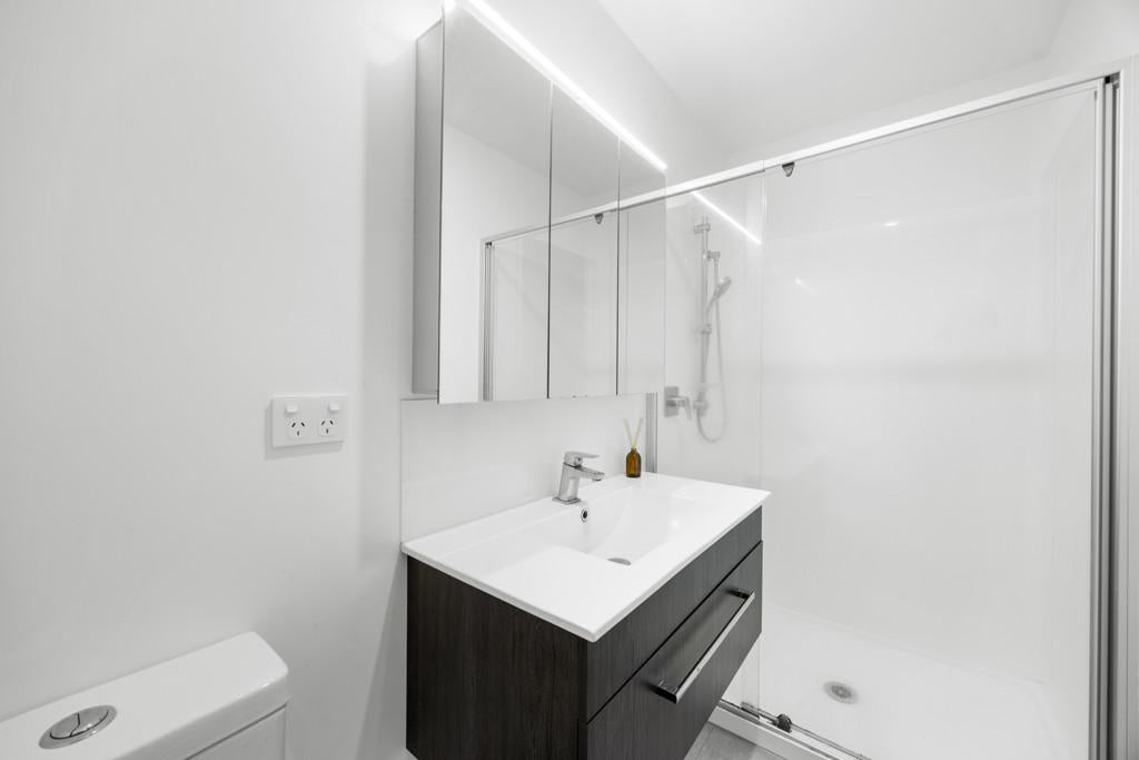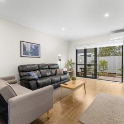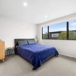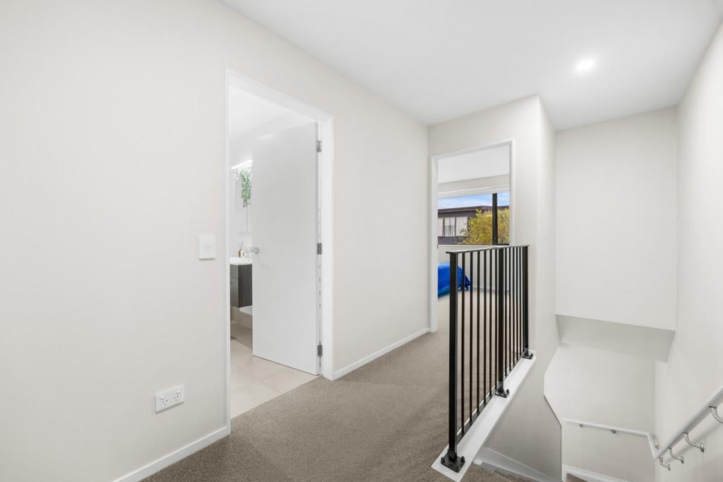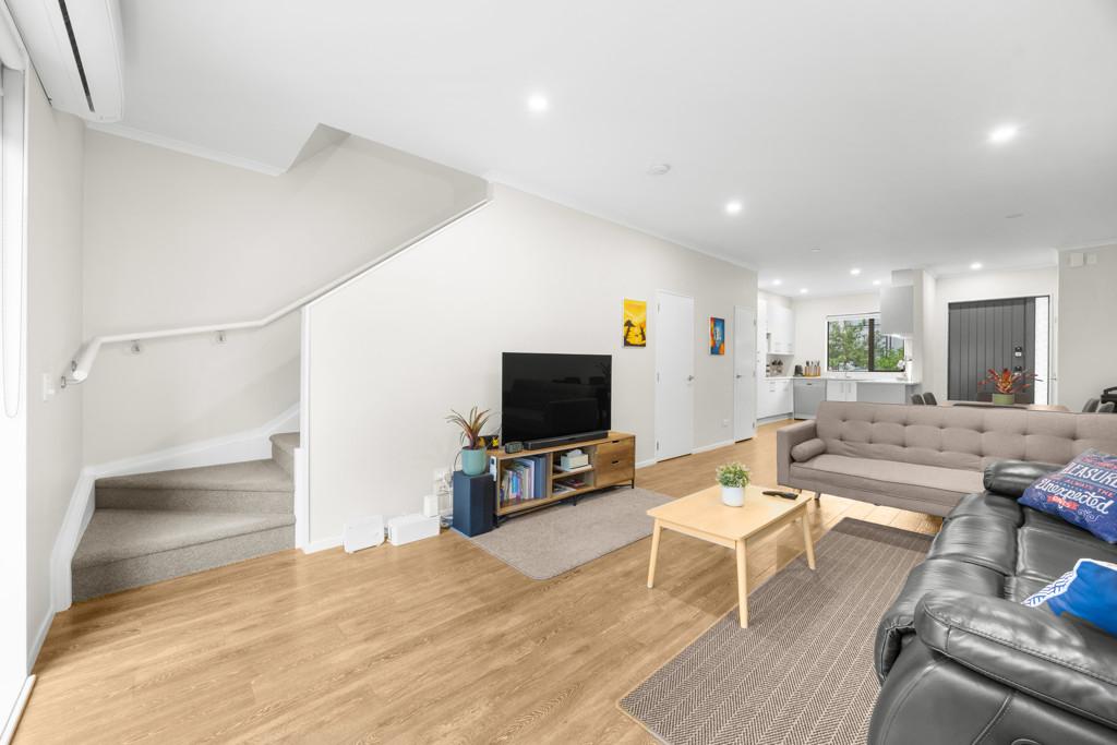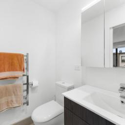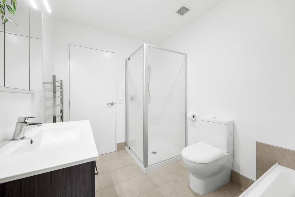 Three bedrooms upstairs all have wardrobes, with the sunny master having its own walk-in closet and ensuite with a heated towel rail. A second bathroom echoes the same minimalist aesthetic, while a powder room guest toilet downstairs sits alongside the hideaway laundry. A heat pump efficiently delivers warmth in a winter home designed to also be well ventilated and cool in summer. A single car space at the door is convenient for parents with babies and groceries to juggle, while more shared residents' parking spaces are available on the nearby tree-lined street.