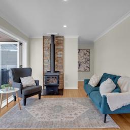 At the centre of the home, the family living area sits alongside the kitchen, anchored by a cosy fireplace that creates a welcoming atmosphere through the cooler months. Large doors open seamlessly out to the expansive deck, an outstanding outdoor entertaining area perfect for long summer lunches, evening gatherings, or simply enjoying the peaceful surroundings.