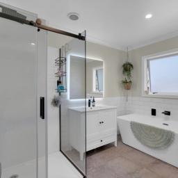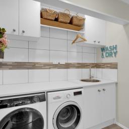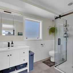 The main bathroom is equally impressive, finished with modern fittings and a refined feel. Nearby, a cleverly designed laundry nook combines practicality with style, completing the home’s thoughtful layout.