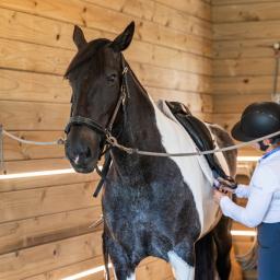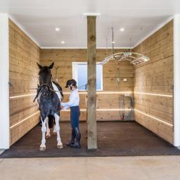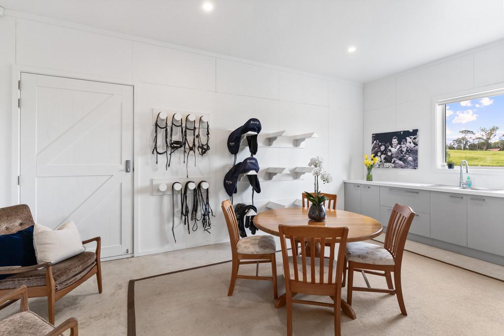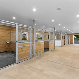 The impressive stables complex by Harrison Lane includes four full height stables with Stable Comfort rubber mattress flooring, concrete breezeway, wash bay with LED lighting, hot and cold-water hosing points, non-slip rubber safety flooring solarium, plus dedicated tack, feed and rug rooms. Upstairs, a generously sized lunchroom opens onto an expansive deck with sweeping views of the arena and beyond, complemented by a changing room, storage areas, separate WC, and a bathroom-forming a complete, purpose-built training hub.