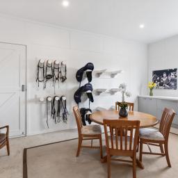 Beyond the exceptional riding facilities, the residence itself delivers equally impressive lifestyle living. Sun-drenched and generously proportioned, the five-bedroom home unfolds around expansive open-plan living, seamlessly drawing the outdoors in with sweeping views across manicured lawns and well-appointed paddocks. A separate lounge offers an intimate retreat, while multiple alfresco zones - including one with its own outdoor fireplace - allow you to follow the sun from morning gatherings to evening soirees. Country-scale laundry, triple internal-access garaging, and substantial attic storage complete the picture delivering effortless performance without compromising lifestyle.