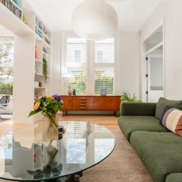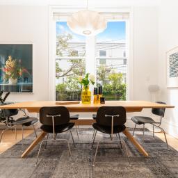 Soft materiality runs throughout: linen, wool, solid oak and sculptural lighting made possible by generous ceiling height. This layered and textural approach results in an elevated and very liveable interior.