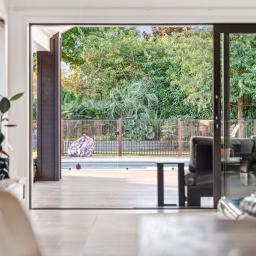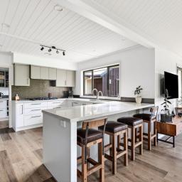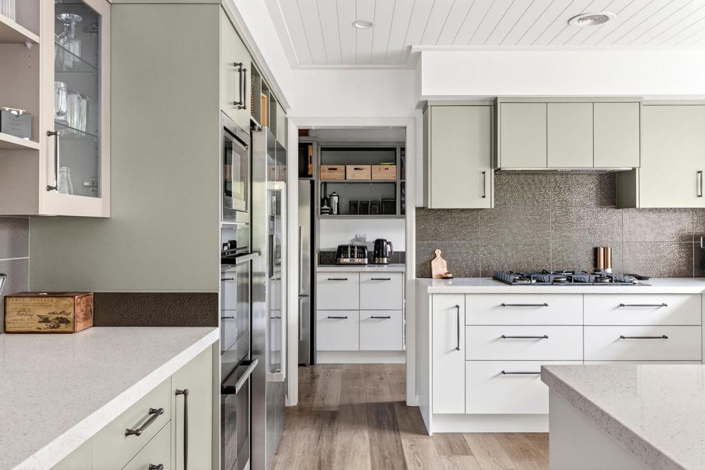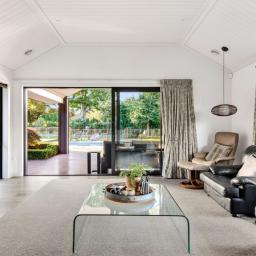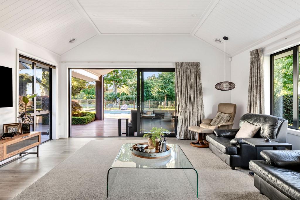 The home unfolds around a generous open-plan living area where a striking pitched ceiling finished with tongue-and-groove paneling adds architectural character, warmth and a wonderful sense of space. Stacking sliding doors create a seamless connection to the outdoors, opening to sheltered alfresco spaces that overlook the manicured grounds and stunning pool which creates a fabulous focal point for summer entertaining and relaxed afternoons by the water. A second separate lounge offers valuable versatility for family life and elegant entertaining.