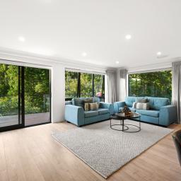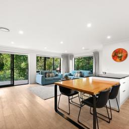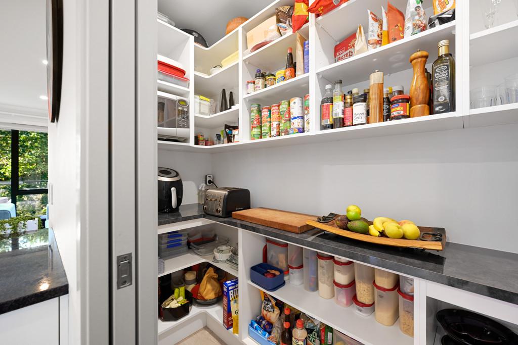 The main living level is bright, open and welcoming, designed to capture natural light and the surrounding greenery. Large windows frame the leafy outlook while sliding doors open to a balcony directly off the living area, creating a seamless connection to the outdoors and an inviting place to relax or entertain. At the centre of the home, the kitchen is both stylish and highly functional. Stone benchtops, quality appliances and a generous walk-in pantry provide excellent everyday practicality, while a built-in dining table wraps around the kitchen bench, creating a natural gathering point for entertaining.