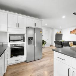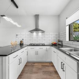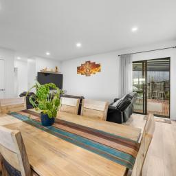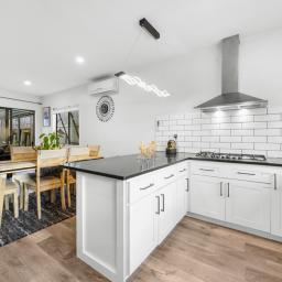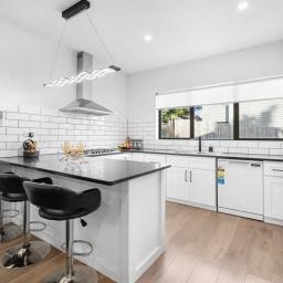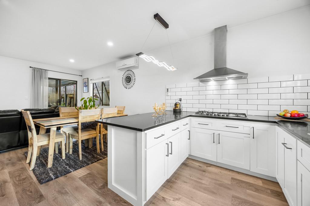 At the centre of the home is a striking black and white designer kitchen featuring quality appliances and a practical breakfast bar ideal for busy mornings or casual entertaining. The kitchen flows seamlessly into the open-plan dining and living areas, creating a welcoming space for everyday living and gatherings with family and friends.