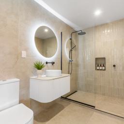 -A beautiful tiled bathroom with luxurious large shower and stylish wall hung vanity