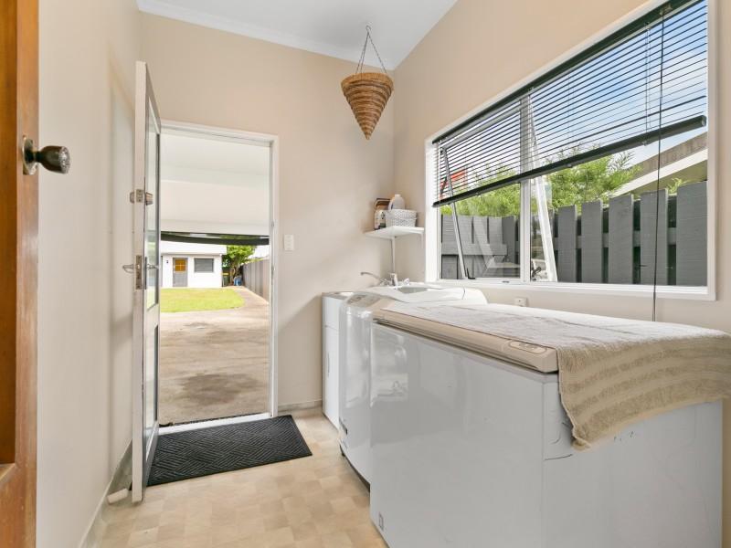 The bathroom is a standout feature, beautifully modern and stylish while still complementing the home’s original charm. It includes both a separate shower and a bath, with the added convenience of a separate toilet. Off the sunroom, the laundry provides easy access to the backyard.