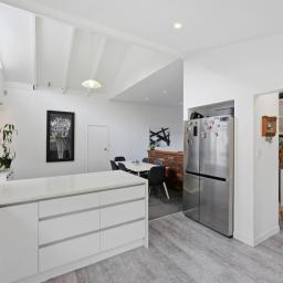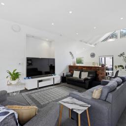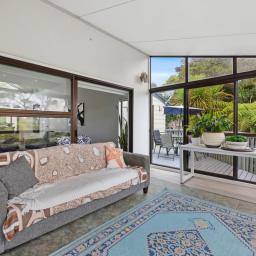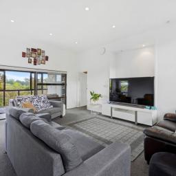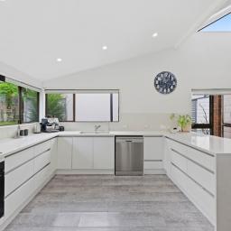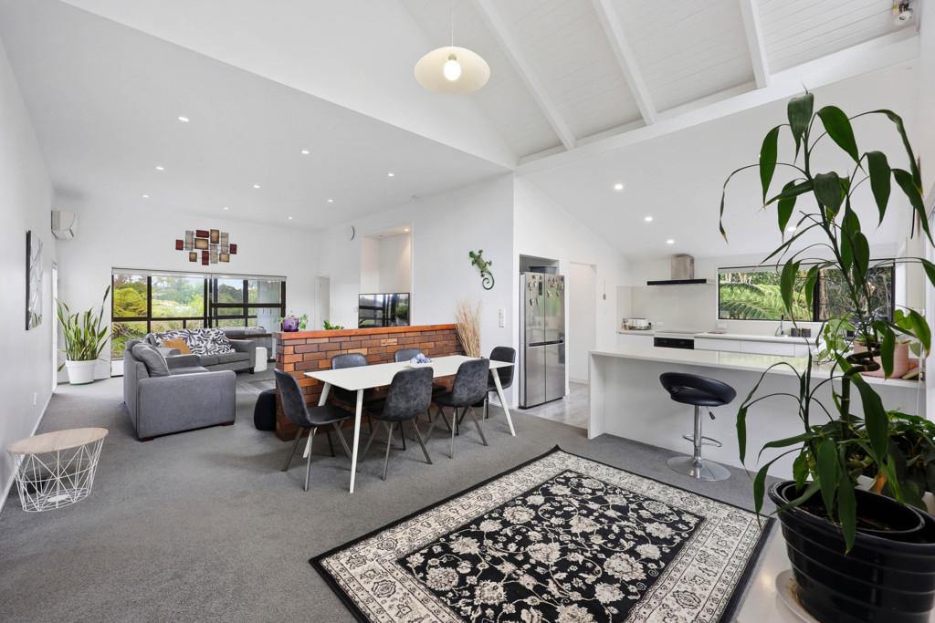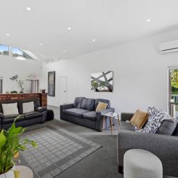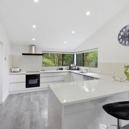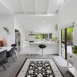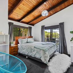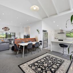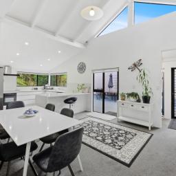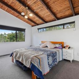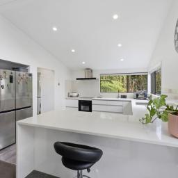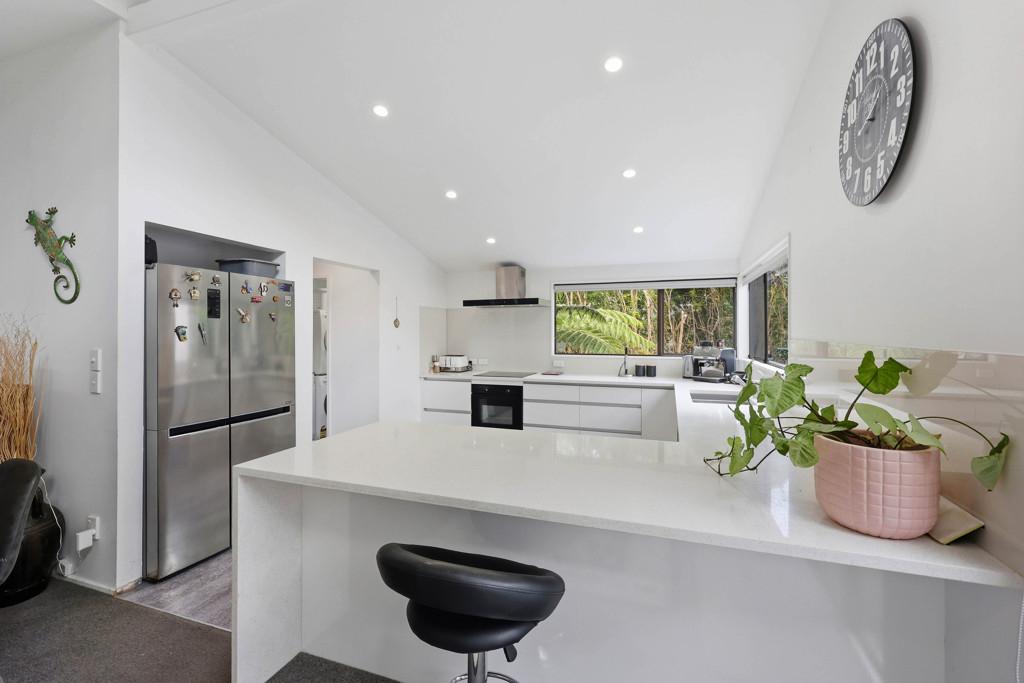 The open plan living area creates a warm and welcoming atmosphere to this family hub. Drenched in sunshine with high ceilings and large decking areas on both sides of the property, this is ideal for entertaining guests or enjoying quiet evenings at home tucked down off the road with peaks of the water and surrounded in bush. The kitchen is grand in size for the whole family to cook together or for entertaining. It is functional and well equipped, making meal preparation a breeze with a large walk in butlers pantry.