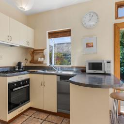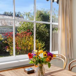 Outside, the setting is equally appealing. The courtyard, easy care lawn and established gardens create a cottage garden atmosphere, framed by a lovely outlook up toward the hills. A mature grapevine adds to the charm, while the easy indoor-outdoor flow from the kitchen makes everyday living and entertaining feel effortless.
