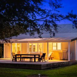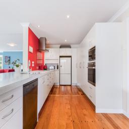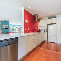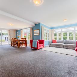 At the centre of the home is a generous open-plan living area anchored by the fireplace. This is where daily life gathers. In winter the fire glows softly while conversations stretch into the evening, and in summer the living space flows easily to the outdoors. The kitchen sits comfortably within the room, designed for connection rather than separation, making it equally suited to everyday family meals or entertaining guests.