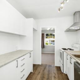 The galley kitchen is equipped with a freestanding oven, rangehood and dishwasher, offering functionality while remaining connected to the living spaces.