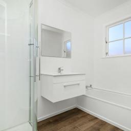 Entry is conveniently positioned off the driveway, welcoming you into a modern interior featuring stylish dark timber-look flooring and a fresh, contemporary feel throughout.