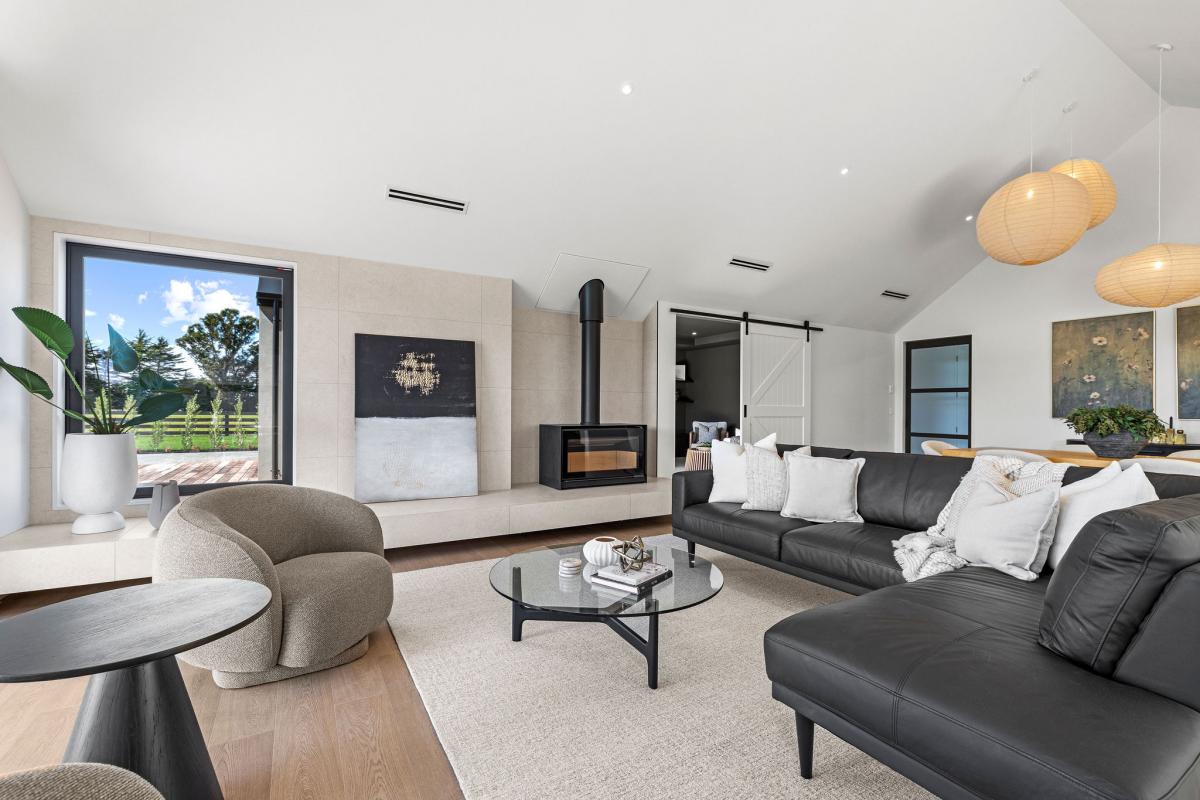 Additional living space is provided by a separate media room or formal lounge adjoining the main living area. Two multi-zone ducted heat pump systems ensure year-round comfort throughout the home, complemented by a standalone log burner that creates warmth and ambience.