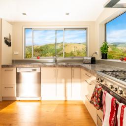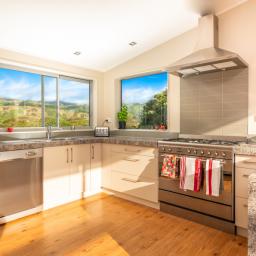 It's double-glazed (except for a garage window) and fully insulated, with solar water heating, underfloor heating in the bathrooms, a woodburner in the lounge, and is wired for home theatre and central vacuuming (complete with a kickboard outlet in the kitchen for instant sweeping).