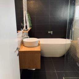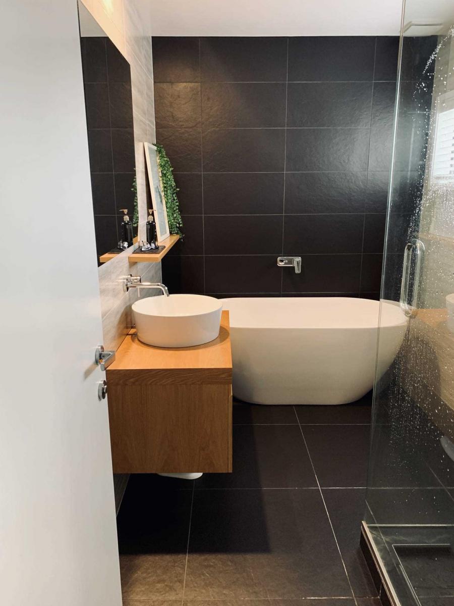 •    Stylish, fully-tiled bathroom with a frameless shower, Michel Cesar designer vanity and bath