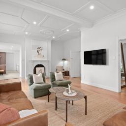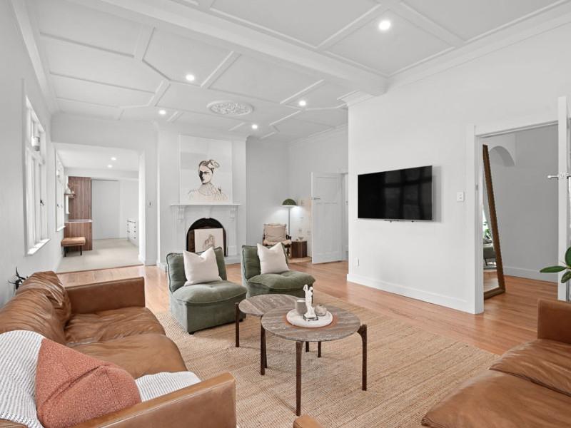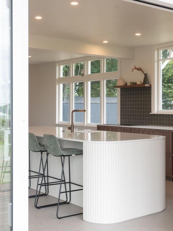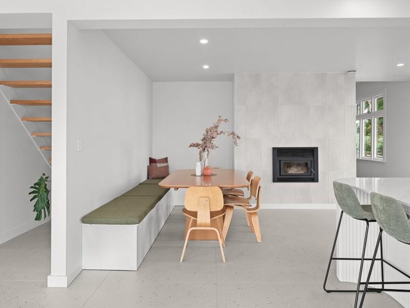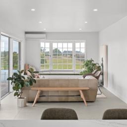 Inside, the home opens to a cosy living room – an inviting space for quiet evenings or gathering with family. The layout then expands into the main living hub: a light-filled open-plan kitchen, dining and family area designed for everyday life.