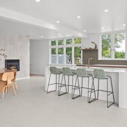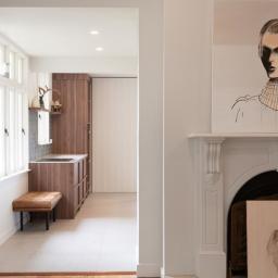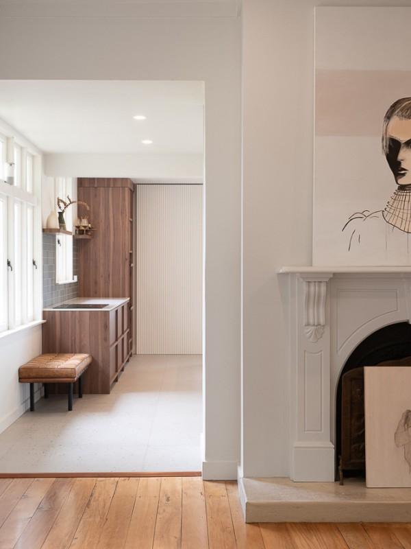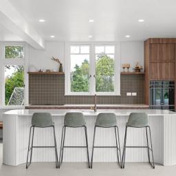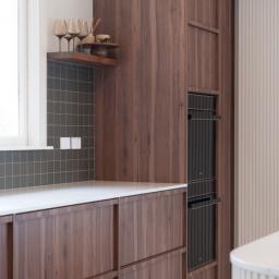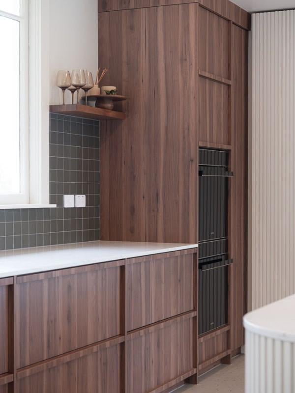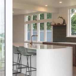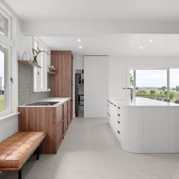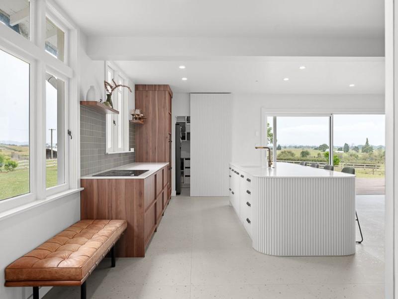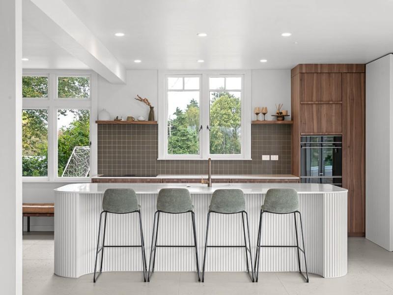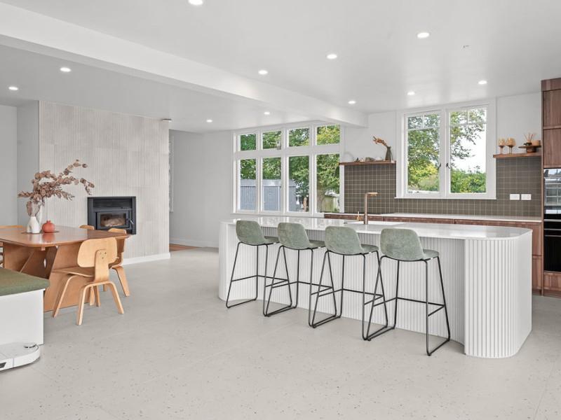 The kitchen sits at the centre of the space, anchored by a generous island that naturally draws people together. Warm timber cabinetry, tiled surfaces, double wall ovens, and a walk-in pantry combine style with practicality, while wide windows bring in natural light and views of the garden.