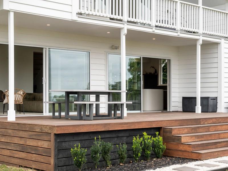 Dining and family areas connect easily to a generous deck, creating a relaxed indoor-outdoor flow and a lovely place to enjoy the surrounding grounds.