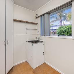 Spacious laundry with storage.