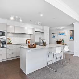 The modern kitchen is ideal for both everyday living and effortless entertaining, complete with a 5-burner induction cooktop, double wall ovens, composite stone benchtops with barstool seating, and generous pantry space. The thoughtful layout separates the master suite from guest accommodation, offering privacy and comfort for both residents and visitors. Wide hallways, a secure lift, and level access throughout ensure ease of living, while the elegant lobby sets a welcoming tone from the moment you arrive.