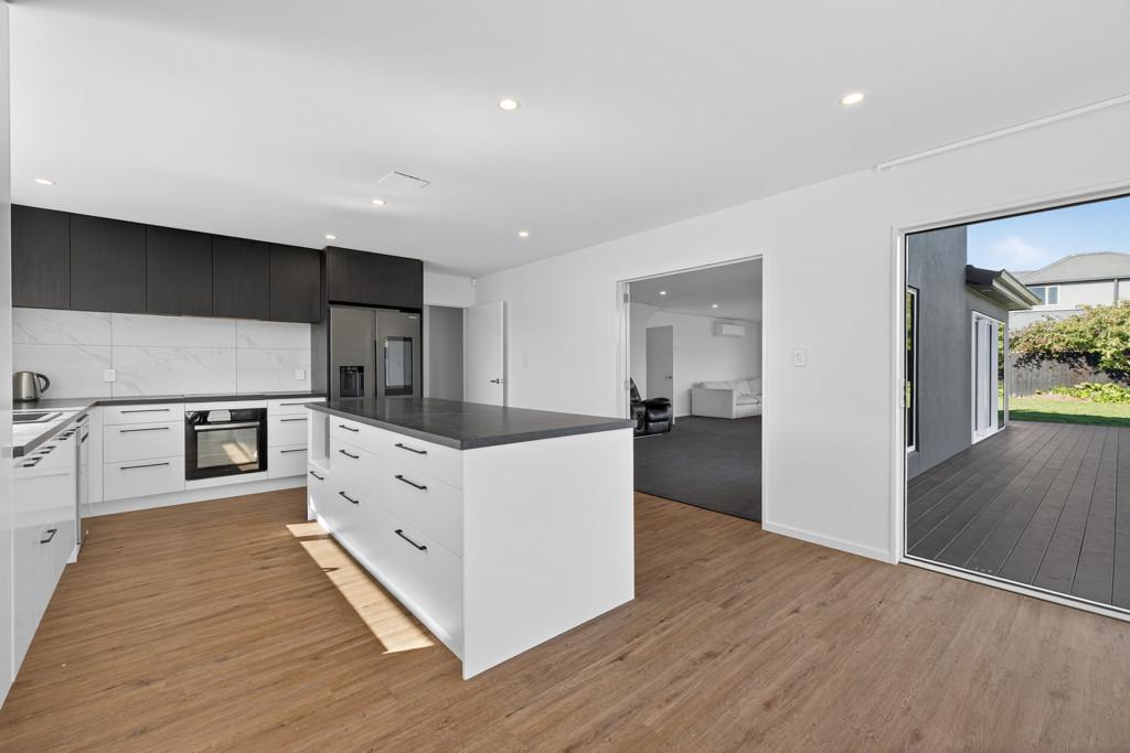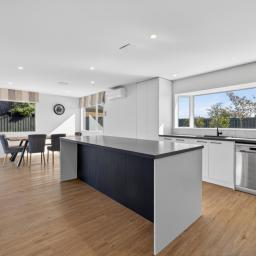 The heart of the home is the open-plan kitchen and dining area, perfect for everyday living and entertaining. The stylish kitchen offers ample storage and workspace, flowing into a generous living area. Both the dining and living spaces open through sliding doors onto the outdoor deck, creating a seamless indoor/outdoor lifestyle.