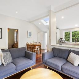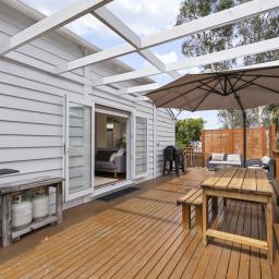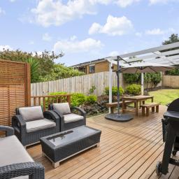 The heart of the home is the light-filled open-plan kitchen, living, and dining area. Skylights above enhance the natural light, creating a bright and inviting space to relax or gather with friends and family. Designed for entertaining, this central living zone flows effortlessly out to a sunny wrap-around deck - ideal for year-round outdoor living - and a fully fenced grass area perfect for kids or pets.