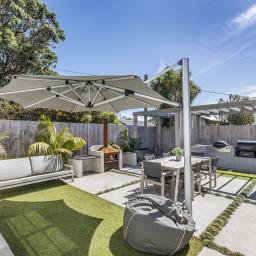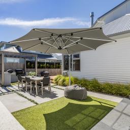 Practicality has not been forgotten either. A separate laundry with a walk in linen cupboard, electric blinds and a wine fridge adds further functionality. The fully fenced section provides ample space for the boat, outdoor toys and trampoline.