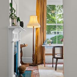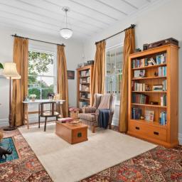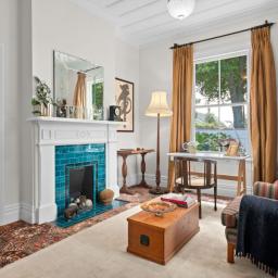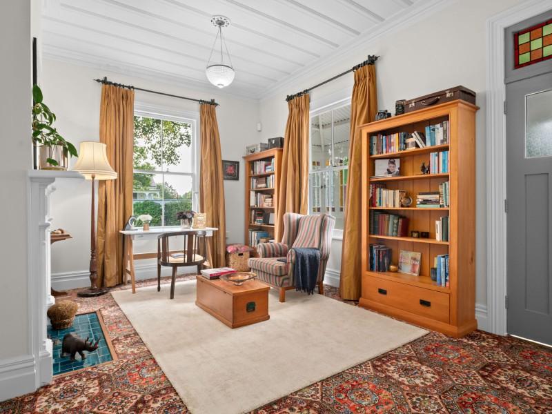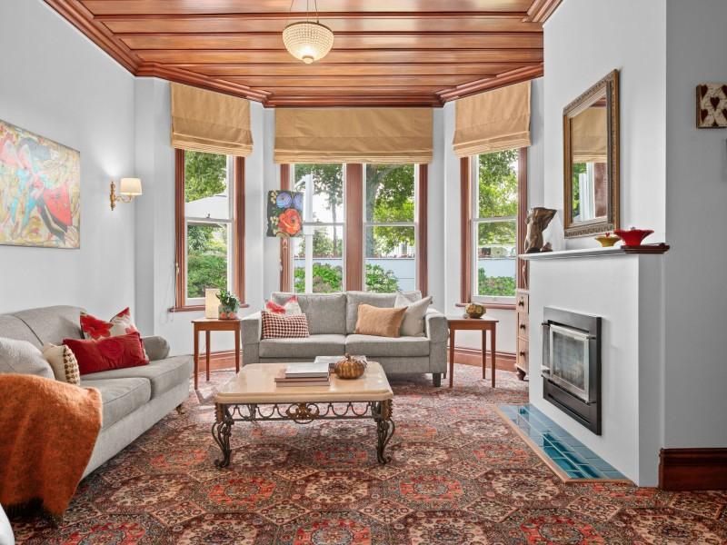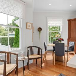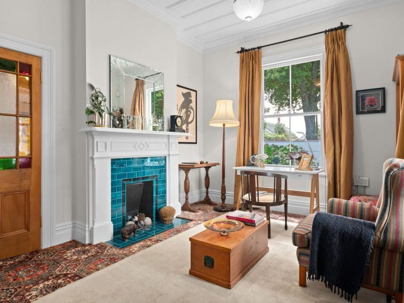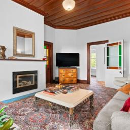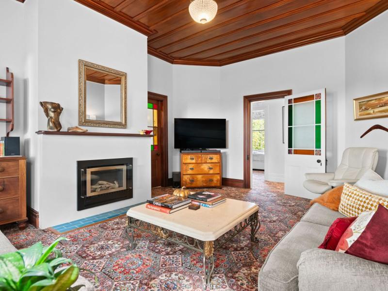 Inside, the home unfolds with all the grace and craftsmanship you would expect from a property of this era. High ceilings, ornate detailing, beautiful light fittings and large windows create spaces filled with warmth, light and personality. There are two separate living rooms, both welcoming and intimate, each framed by large windows that draw in the surrounding gardens. The main living room is anchored by a gas fireplace, creating a space that feels cosy and inviting through every season.