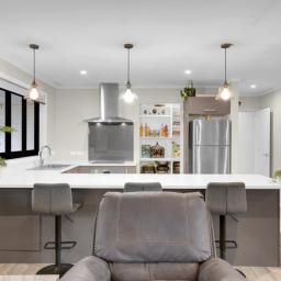 The modern kitchen is both functional and stylish, conveniently positioned to connect with the living and dining areas, making everyday routines effortless.