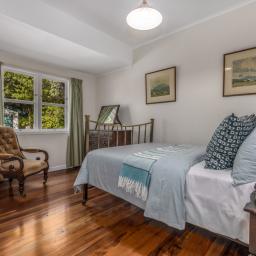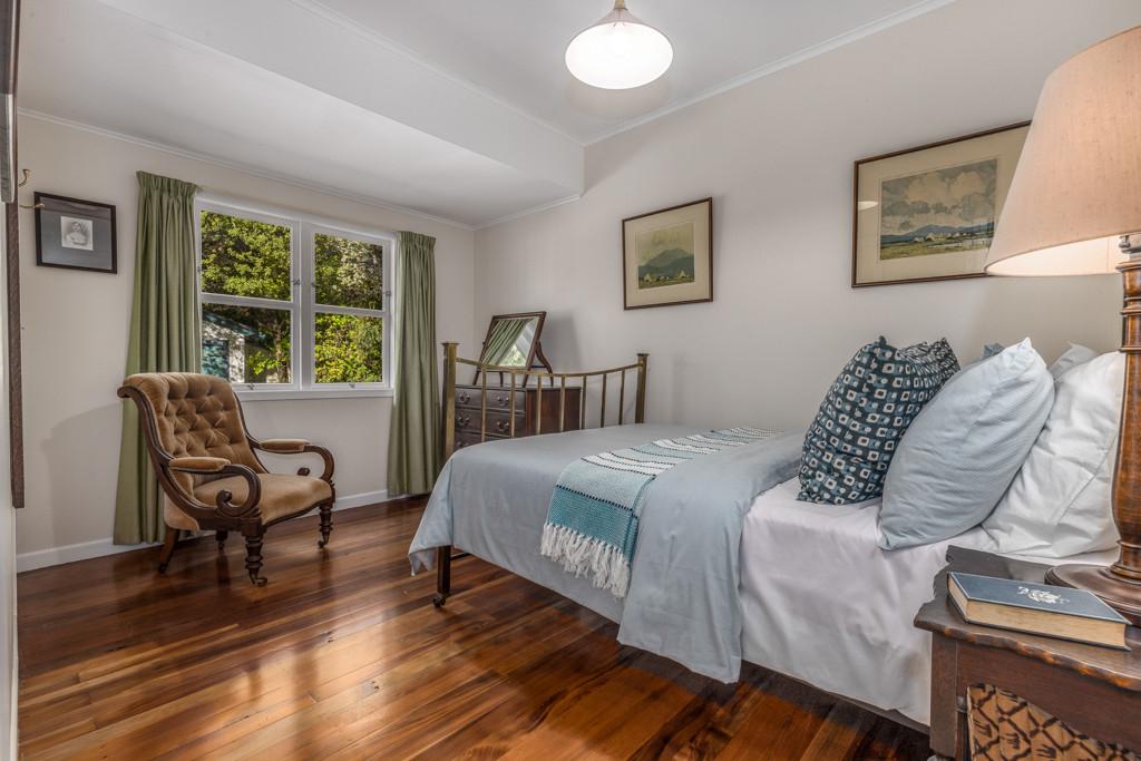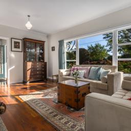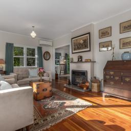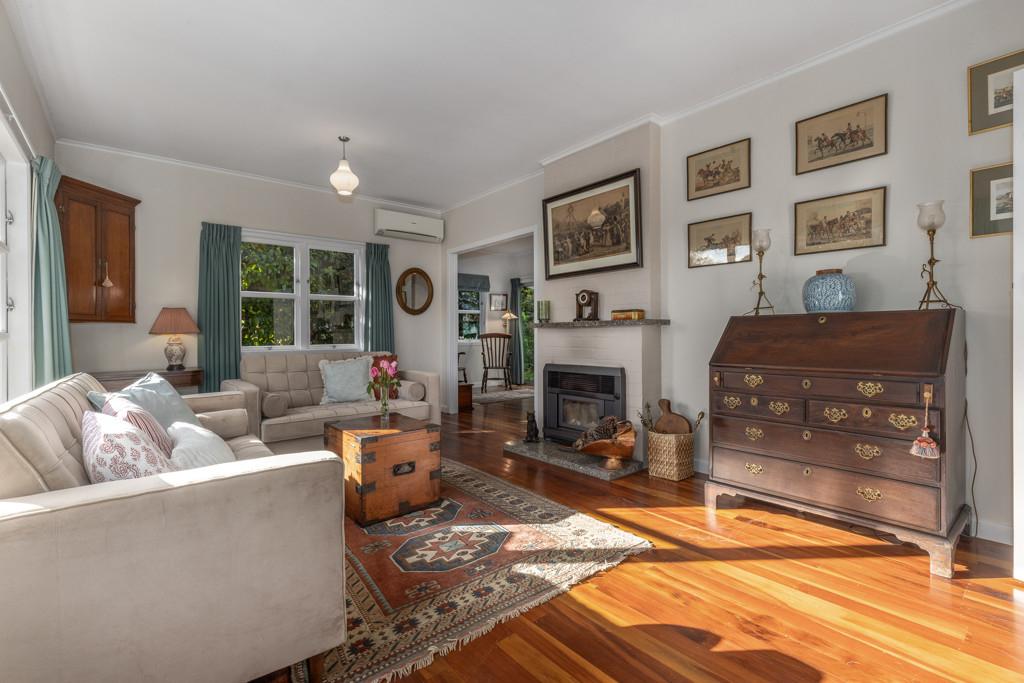Built in the 1960s, the home carries the warmth of its era. Inside, beautiful matai floorboards add natural character, while the generous lounge with fireplace and heat pump enjoys a tranquil outlook across the garden.