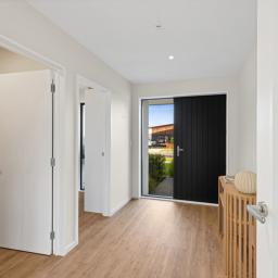 The master bedroom is generously sized and offers outdoor access along with a walk-in wardrobe. The ensuite is finished with tiled flooring, underfloor heating, and a tiled shower, adding a touch of everyday luxury. Two additional bedrooms are well-served by a family bathroom with bath, plus the convenience of a separate toilet.